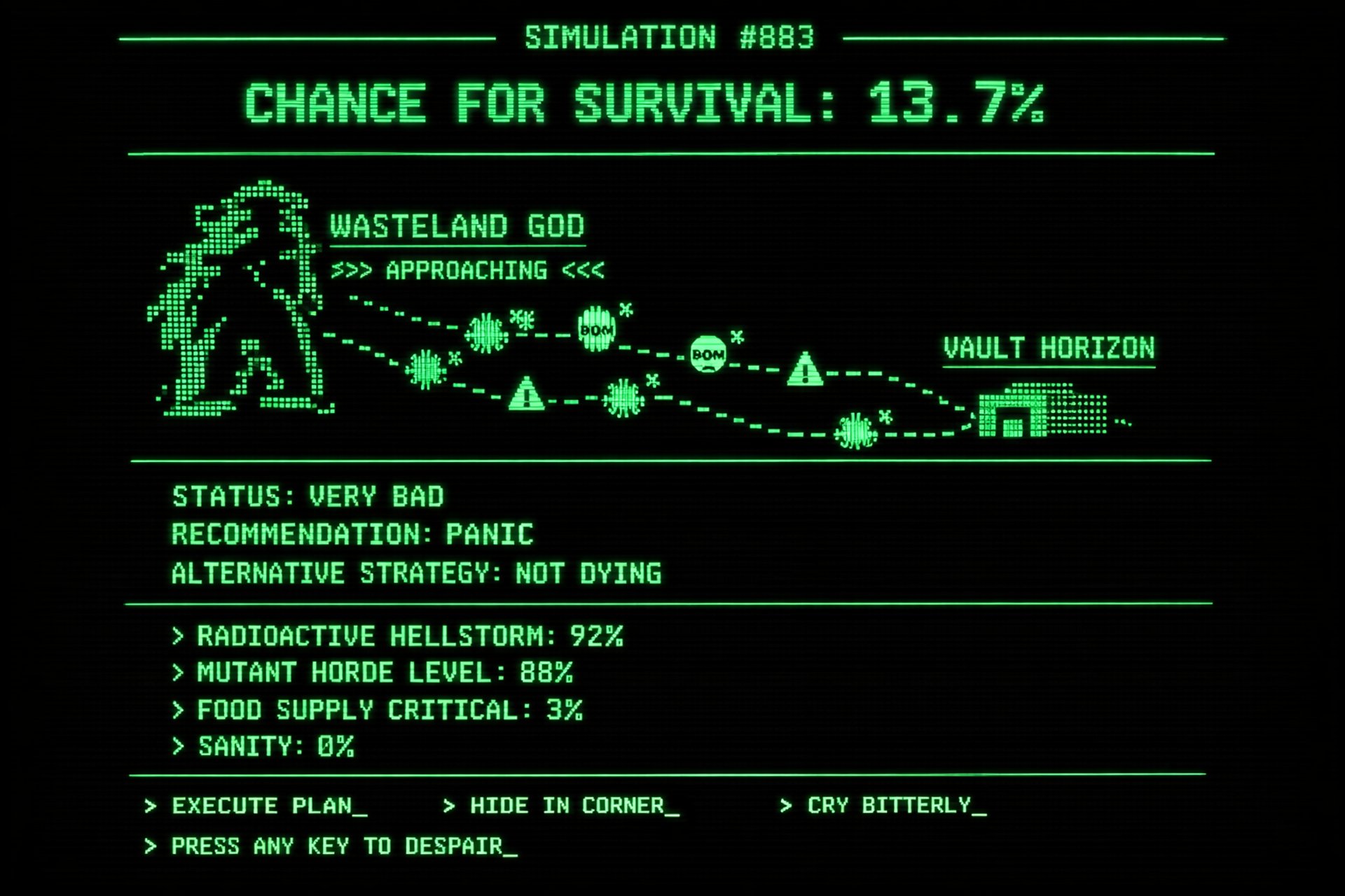 En titan kendt som The Wasteland God bevæger sig mod Vault Horizon. Simulationer viser, at hvis den fortsætter sin kurs, vil den nå vaulten inden for 72 timer, og Horizon har næsten ingen chance for at overleve et direkte angreb.